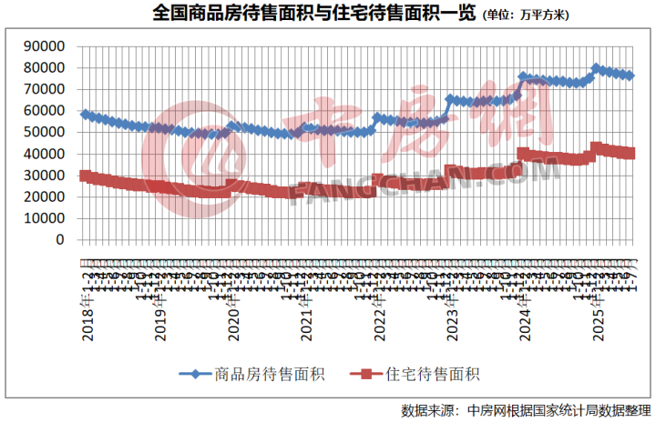 商品房库存方面,连续五个月减少。截至7月末,商品房待售面积76486万平方米,比6月末减少462万平方米。其中,住宅待售面积40536万平方米,减少285万平方米。